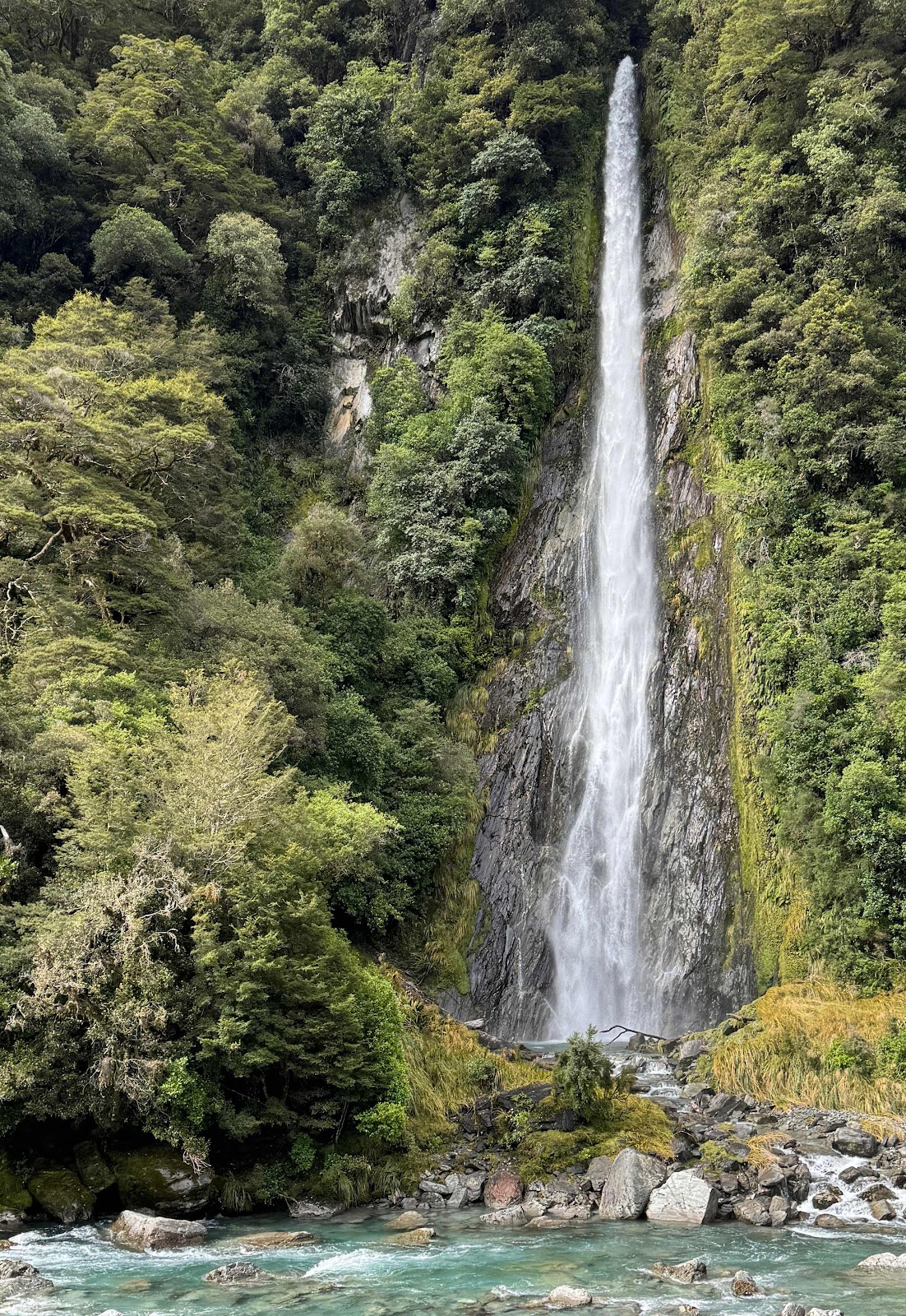 Ninety foot high Thunder Creek Falls is the terminus of a small tributary draining into the Haast River.
